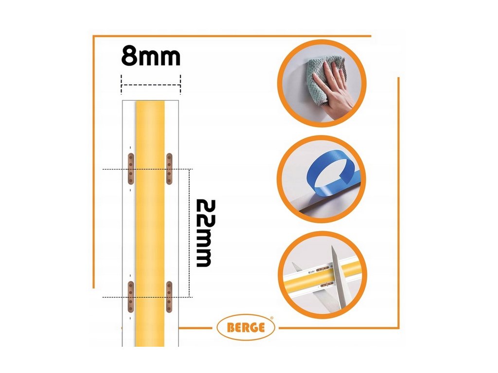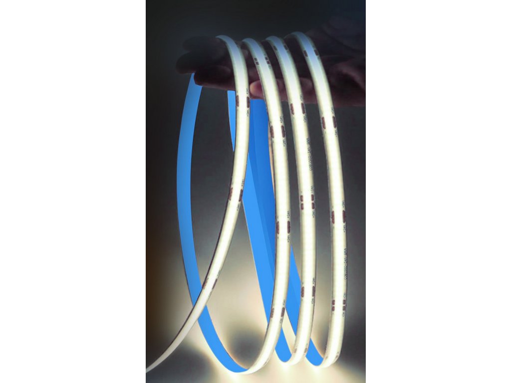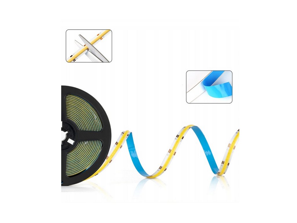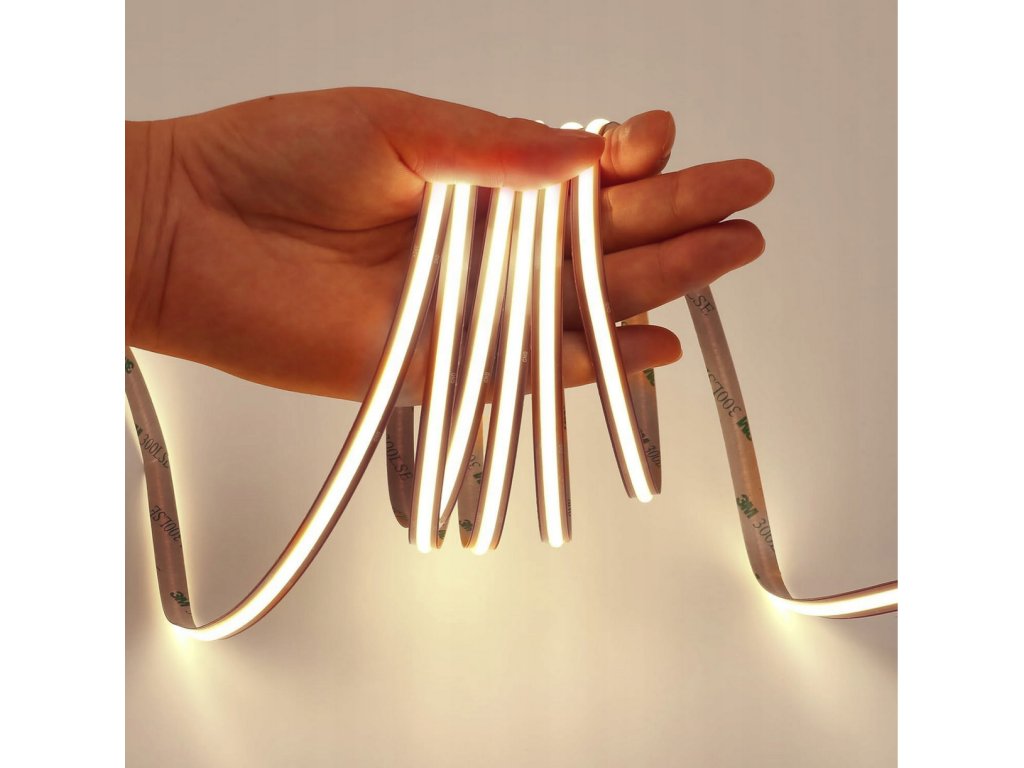 Moderný COB Neon 12V LED pásik s vysokou svietivosťou 990 lm/m, vyžarujúci studené biele svetlo (6000K) . Vďaka hustote 480 diód na meter a šírke 8 mm poskytuje rovnomernú líniu svetla bez viditeľných LED bodov.