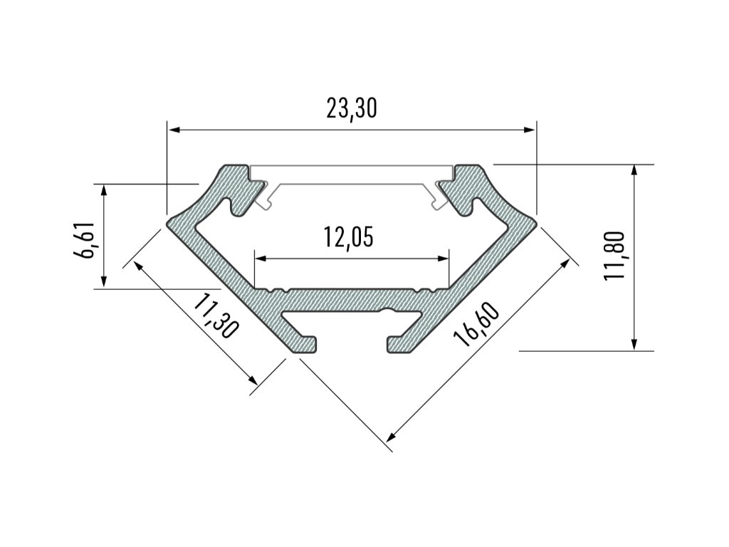 Rohový hliníkový profil LUMINES C s uhlom LED pásika 45 stupňov. Jeden z najviac minimalistických a moderných designov. Perfektný na dizajnové prepojenie dvoch kolmých plôch a všade tam, kde je potrebné nasmerovať svetlo vychádzajúce z profilu pod uhlom 45 stupňov.