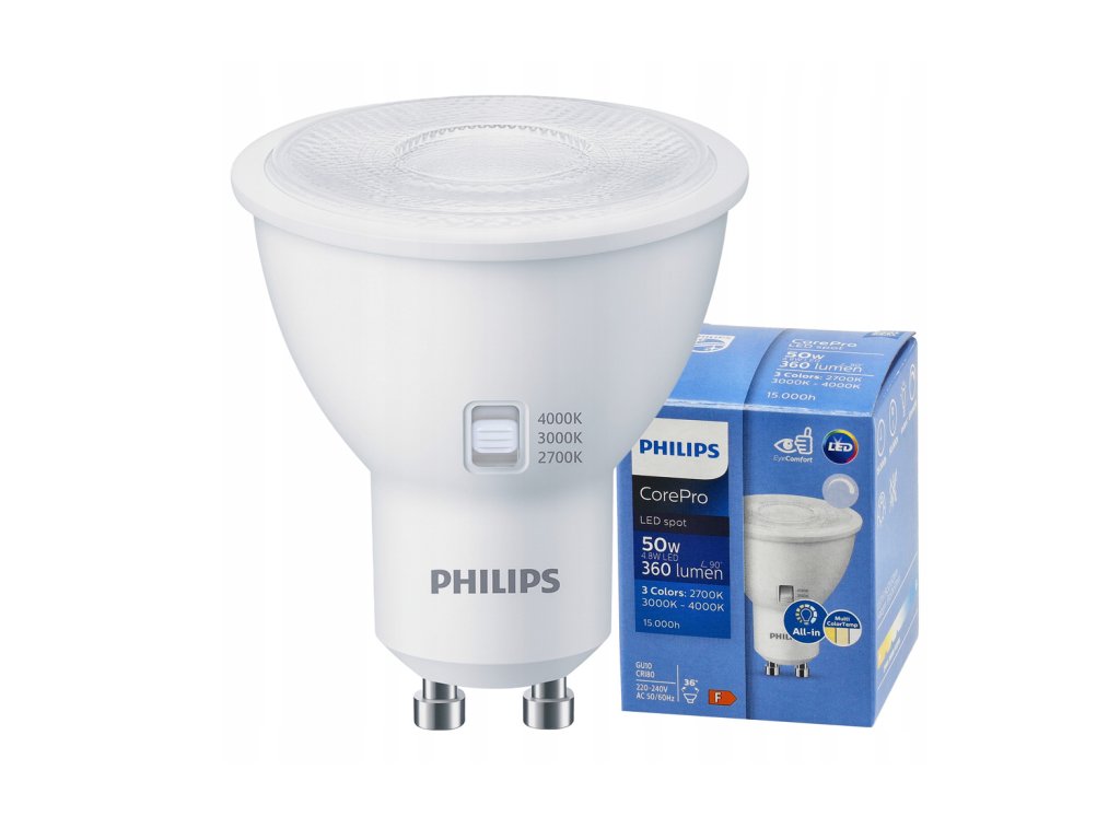 ✨ Technológia CCT – tri farby svetla v jednej žiarovkeŽiarovkaPHILIPS CorePro LEDspot GU10 4,8WJe vybavený modernou funkciouCCT (Vymeniteľná teplota farieb), čo vám umožní vybrať si jeden ztri farby svetla: ✅ 2700 tis. – vytvára útulnú atmosféru, ideálnu do obývačky alebo spálne. ✅ 3 000 000 – univerzálny a prírodný, ideálny na každodenné použitie. ✅ 4 000 000 –zvyšuje koncentráciu, funguje dobre v kancelárii, kuchyni alebo kúpeľni. Vďaka technológiiCCT 3v1Používateľ si môže zvoliť teplotu farieb tak, aby vyhovovala charakteru miestnosti alebo vykonávaným činnostiam. Toto je praktické riešenie, ktoréeliminuje potrebu kupovať niekoľko rôznych žiaroviek– všetko v jednom modeli. | |