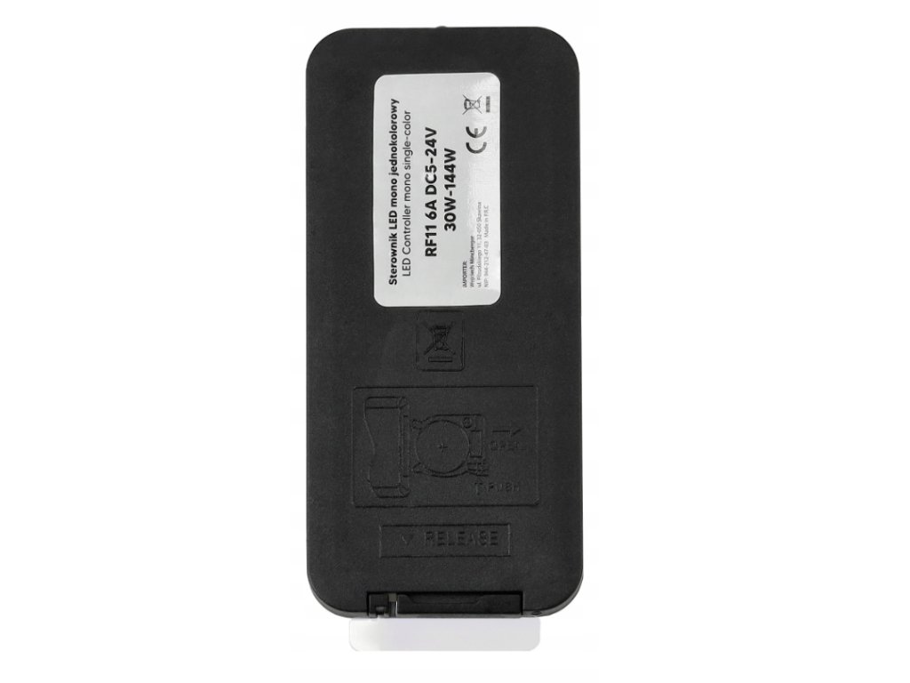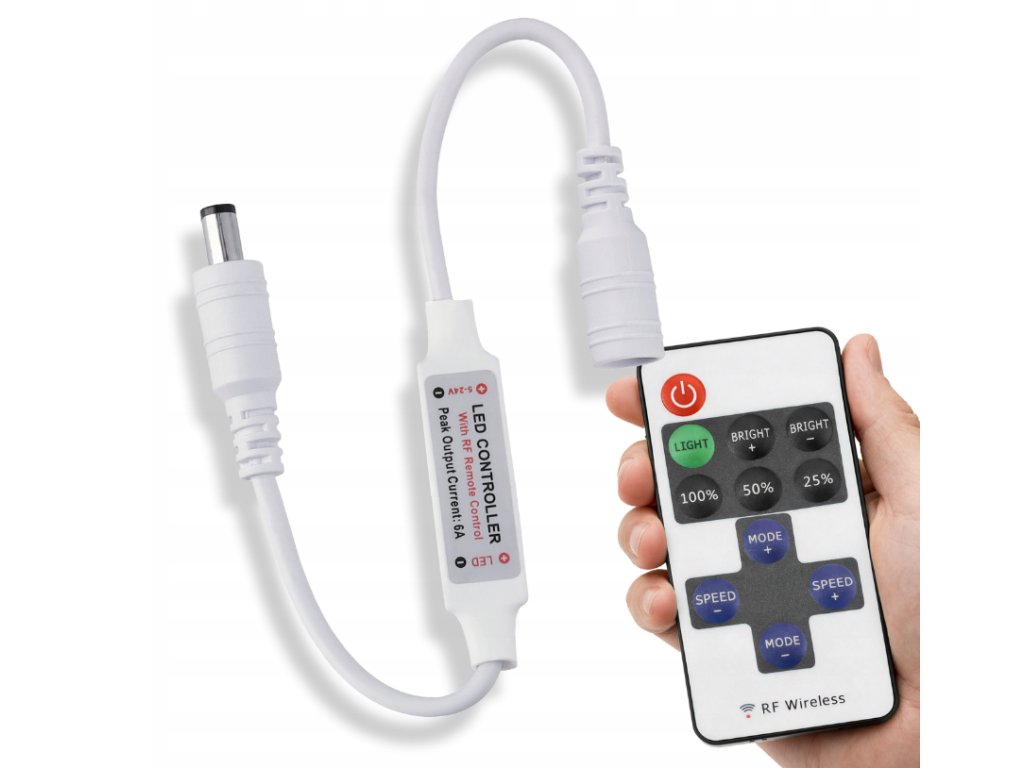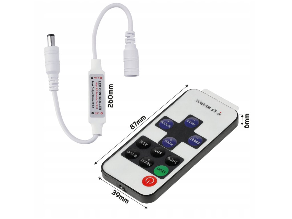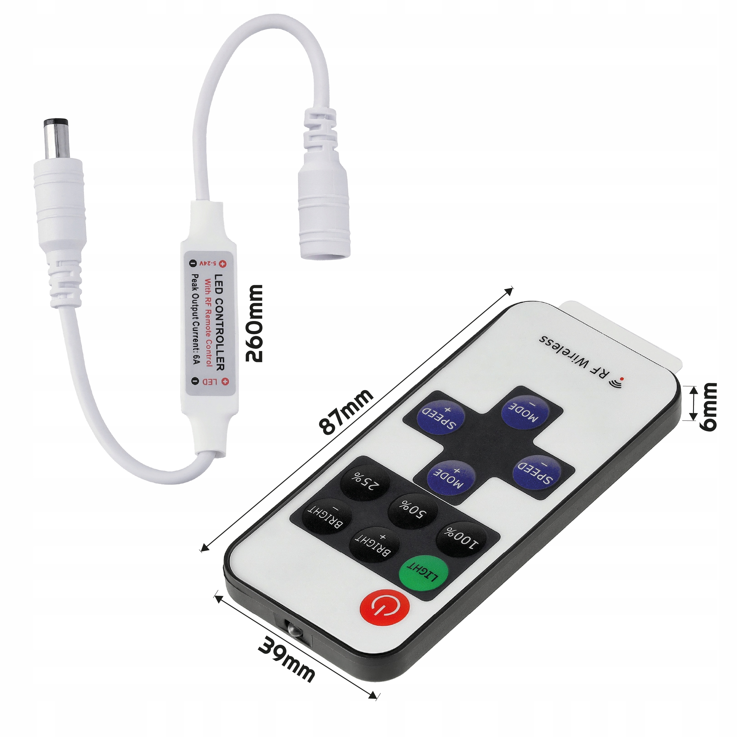 ⚙️ Dane techniczneTyp: sterownik / ściemniacz LED MONO Sterowanie: RF – pilot radiowy Liczba przycisków pilota: 11 Napięcie zasilania: DC 5–24V Napięcie wyjściowe: 12–24V DC Maksymalny prąd wyjściowy: 6A Maksymalna moc: 72W przy 12V 144W przy 24V Stopień szczelności: IP20 Bateria w zestawie: Tak |