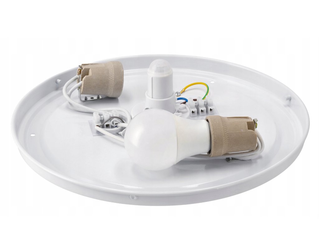 Technické údaje: Model: LED stropné svietidlo 2xE27 Materiál: plast Stupeň krytia: IP20 Napájacie napätie: 230V AC Výstupný výkon: 2xE27 Max výstupný výkon: 2x 40W (E27) Uhol svietenia: 320 ° Vstavaný pohybový a súmrakový senzor: NIE! (Svietidlo bez senzora) Certifikáty: CE, RoHSDodatočné parametre