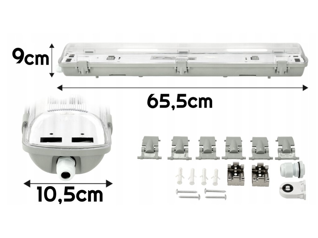 ❓ FAQ – Najczęściej zadawane pytaniaCzy zestaw jest gotowy do montażu? Tak, oprawa oraz dwie tuby LED są w komplecie i w pełni kompatybilne. Czy lampa nadaje się do wilgotnych pomieszczeń? Tak, klasa szczelności IP65 pozwala na użytkowanie w miejscach narażonych na wilgoć i kurz. Jaką barwę światła oferuje zestaw? Zimną białą 6500K – bardzo jasną i techniczną. Czym różni się 6500K od 4000K? 6500K daje chłodniejsze, bardziej kontrastowe światło o wyższej subiektywnej jasności, natomiast 4000K jest łagodniejsza i bardziej neutralna. | |