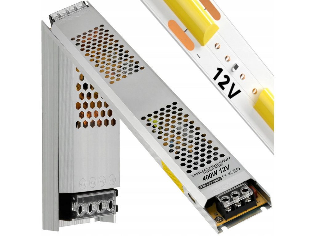 12V 400W 33,33A IP20 LED napájací zdroj pre LED pásik montáž Slim Very Narrow je vynikajúcou voľbou pre väčšie LED inštalácie, ktoré vyžadujú spoľahlivé napájanie.