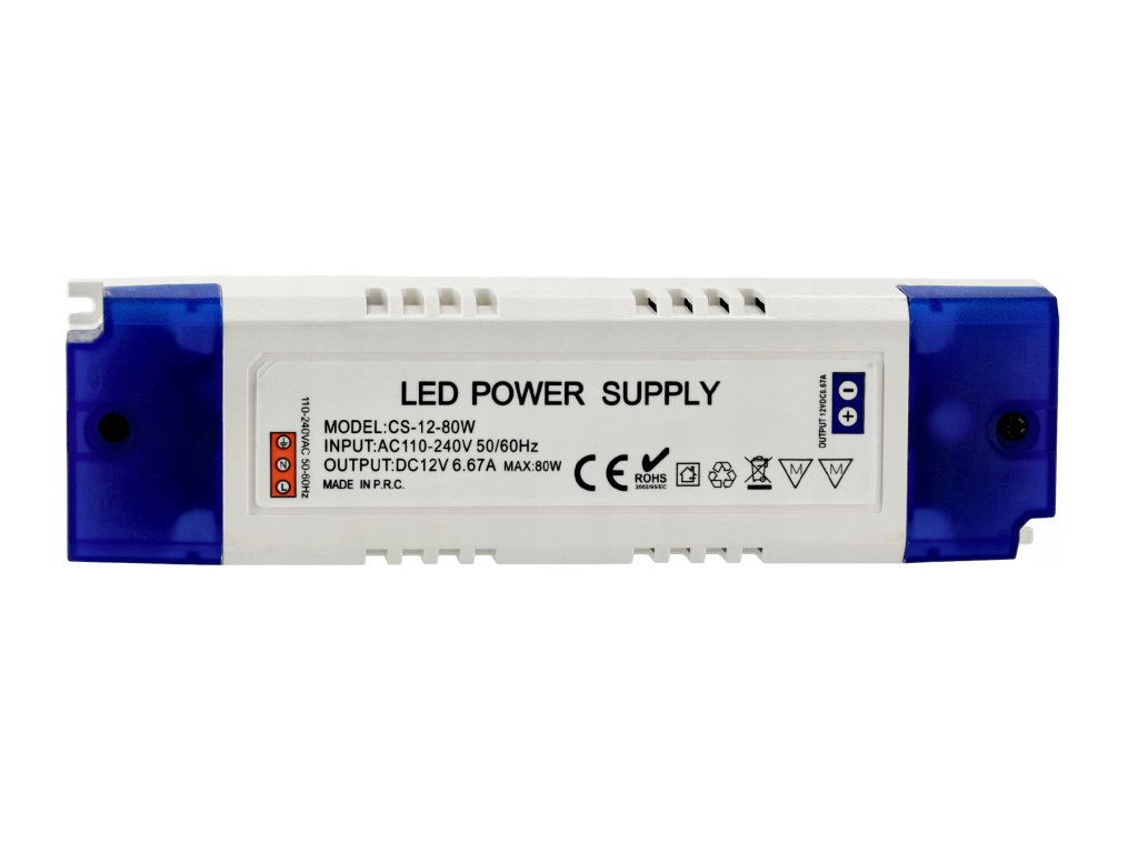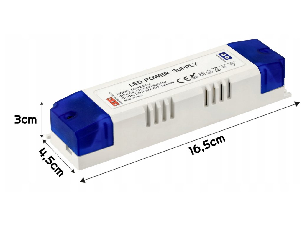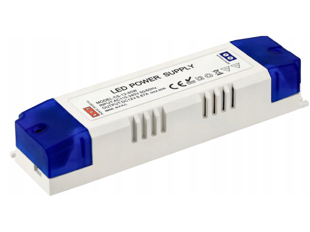 LED zdroj 12V 80W 6,67A - kvalitný transformátor pre LED pásky a ďalšie zariadenia vyžadujúce napätie 12V. Ideálne pre stredne veľké inštalácie v suchých miestnostiach, ako je nábytok, dekoratívne a profesionálne osvetlenie.